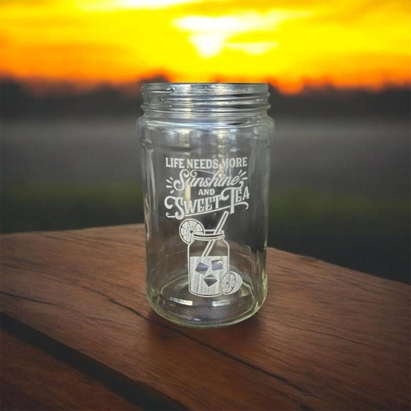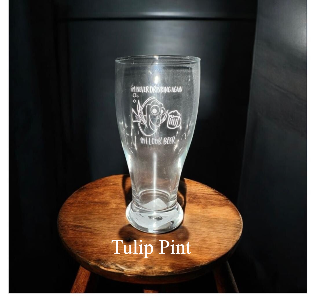 We have a variety of drinking glasses from traditional pints to mason jars for customization. Each will be custom laser engraved with your design, or we would be more then happy to create a design for you at no extra cost! Cheers!